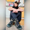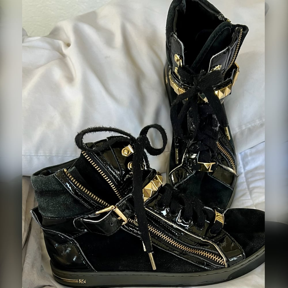 This item a pair of Michael Kors Black Glam Gold Studded High Fashion Sneakers, Size 8.5, straight from Lisa Marie Varon's personal collection. Leather upper and suede. Gunmetal hardware. Lace-up front. Side zip. Studded buckle at ankle. Rubber sole. Gold tone hardware and stud detail.